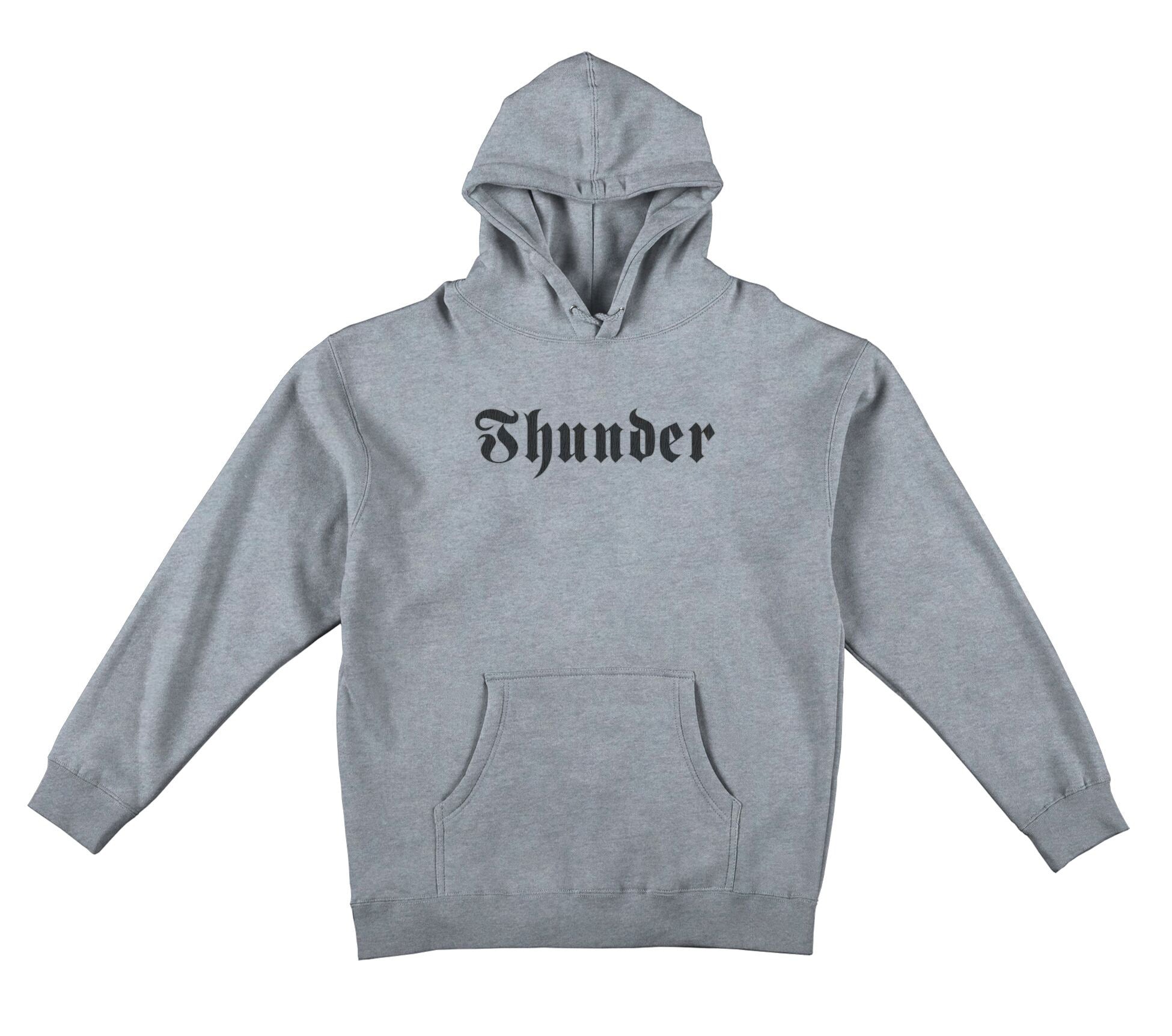 THUNDER SCRIPT EMB HOOD HEATHER GREY w/ BLACK EMBROIDERY