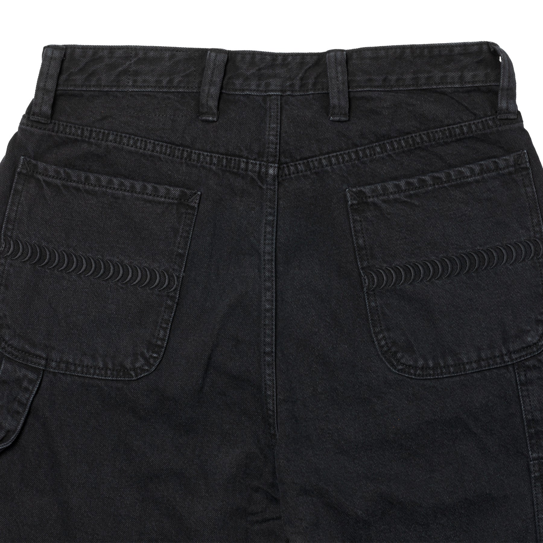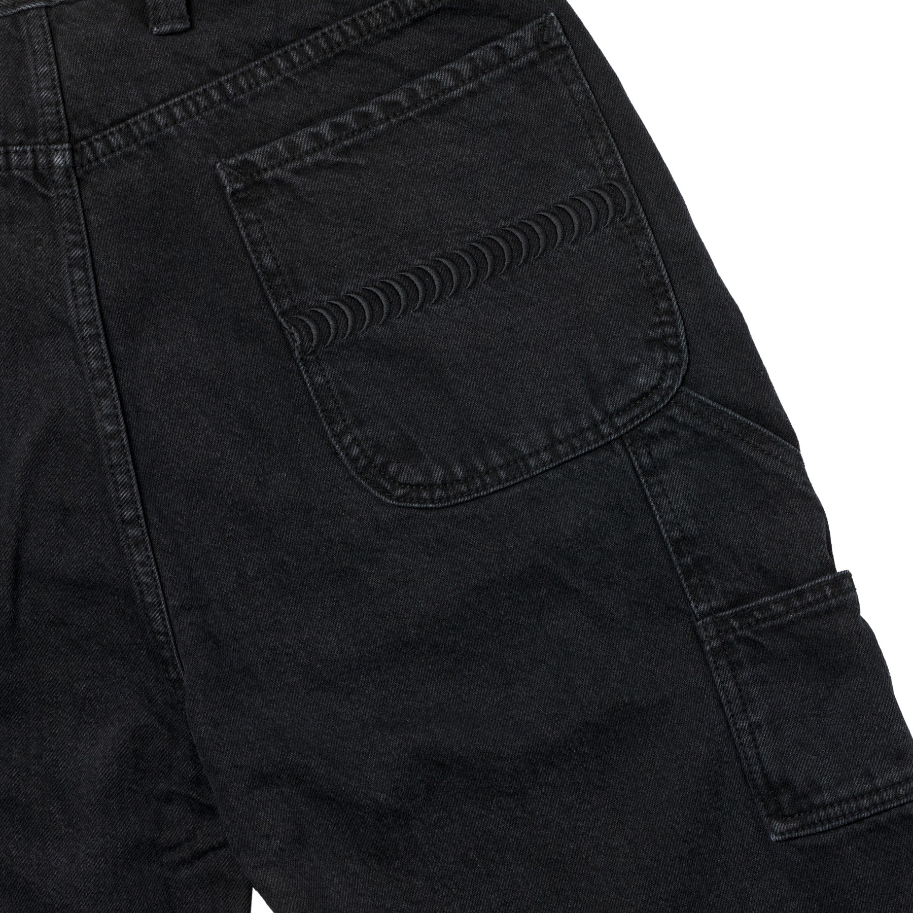 11.4oz 100% cotton relaxed fit washed black denim carpenter short with embroidered logos.